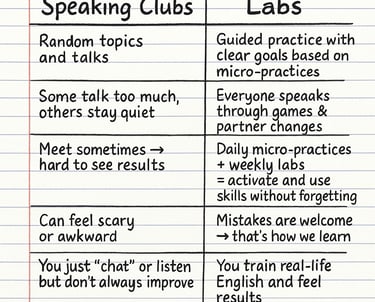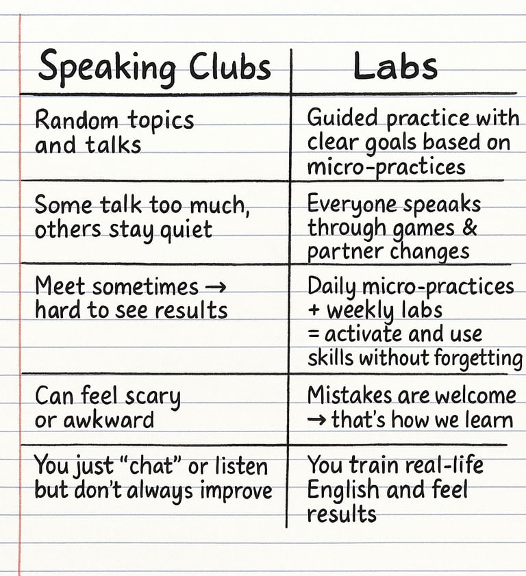 Speaking clubs give you talk time. Labs give you progress.